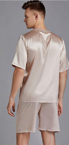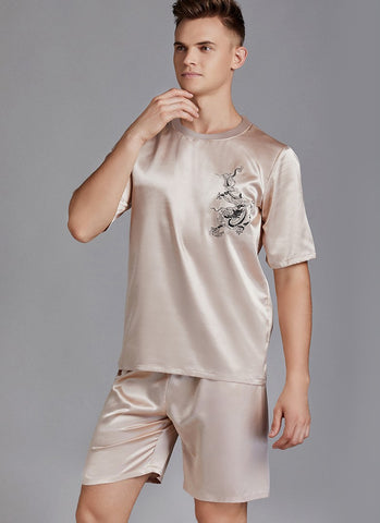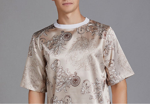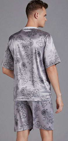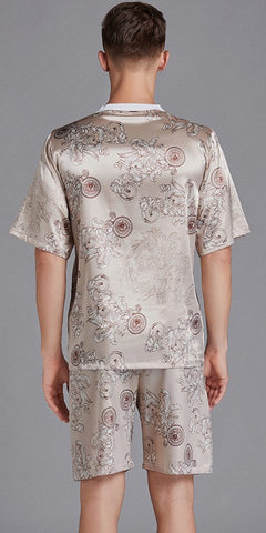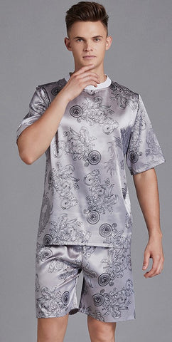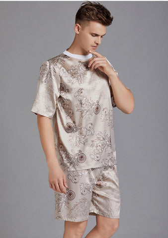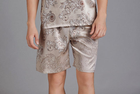Crew Neck Printed Silk Satin Pajamas Men's Short Sleeve Shorts Homewear Set