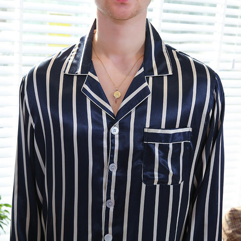 Men's Long Sleeve Pajama Set Striped Silk Satin Loungewear Set