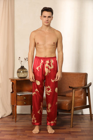 Men's Pajama Pants Set Silk Satin Dragon Pattern Long Sleeve Bathrobe Set